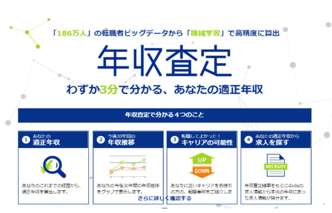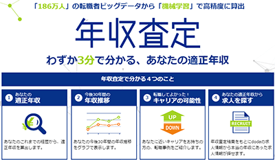年収査定は現在の自分の情報を記入するだけでdoda会員186万人の転職データから あなたの適正年収がたった3分でわかるコンテンツです。経歴をもとに1円単位で適性年収が表示され、現状の年収と比べてどうなのか、自分と似た人の転職事例などの結果も表示されます。また、年収査定の結果をもとに自分の本来の年収に近い求人をdodaが紹介してくれるため年収UPの可能性も高いです。