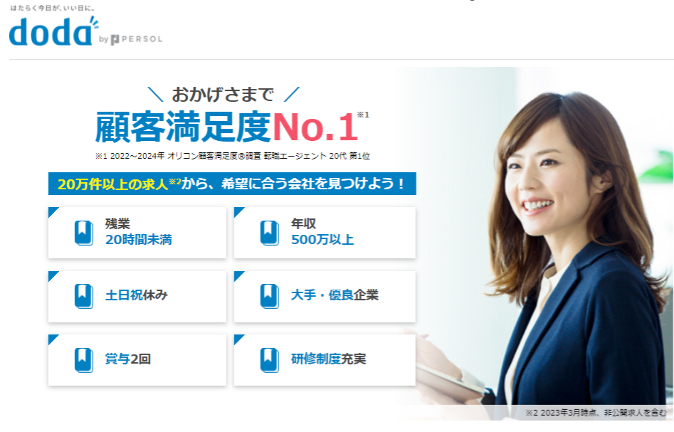 dodaは「転職サイト」と「転職エージェント」の両方の機能を持ち、自分の転職活動のスタイルに合わせ利用方法を選べるため使い勝手が良いです。また、一番の特徴としては10万件以上の求人数。どんなわがままな条件で検索しても検索結果で求人が出てきます。利用者層としては20代~30代前半の若手・中堅層が中心に転職活動で利用しており、顧客満足度No.1のサービスです。
