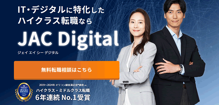 管理職クラス、外資系企業、海外進出企業などハイクラスの転職支援に強みを持っています。JAC Dgitalはロンドン発祥の日系転職エージェントというインターナショナルな企業文化と、世界11カ国に広がる独自のグローバルネットワークを背景としており、外資系企業や海外進出企業への転職支援で特に豊富な実績があります。
